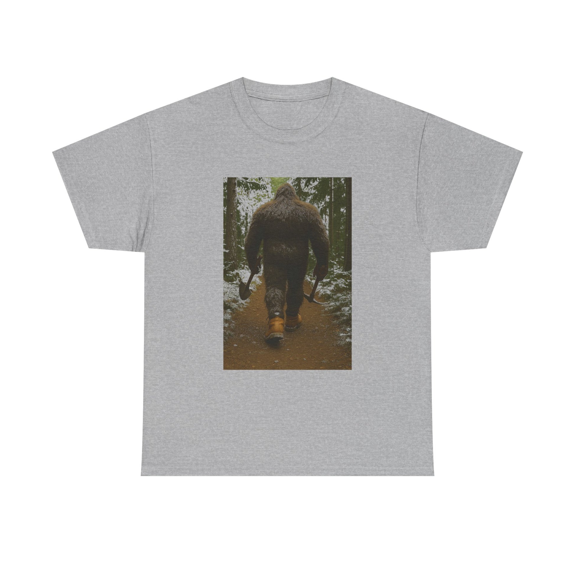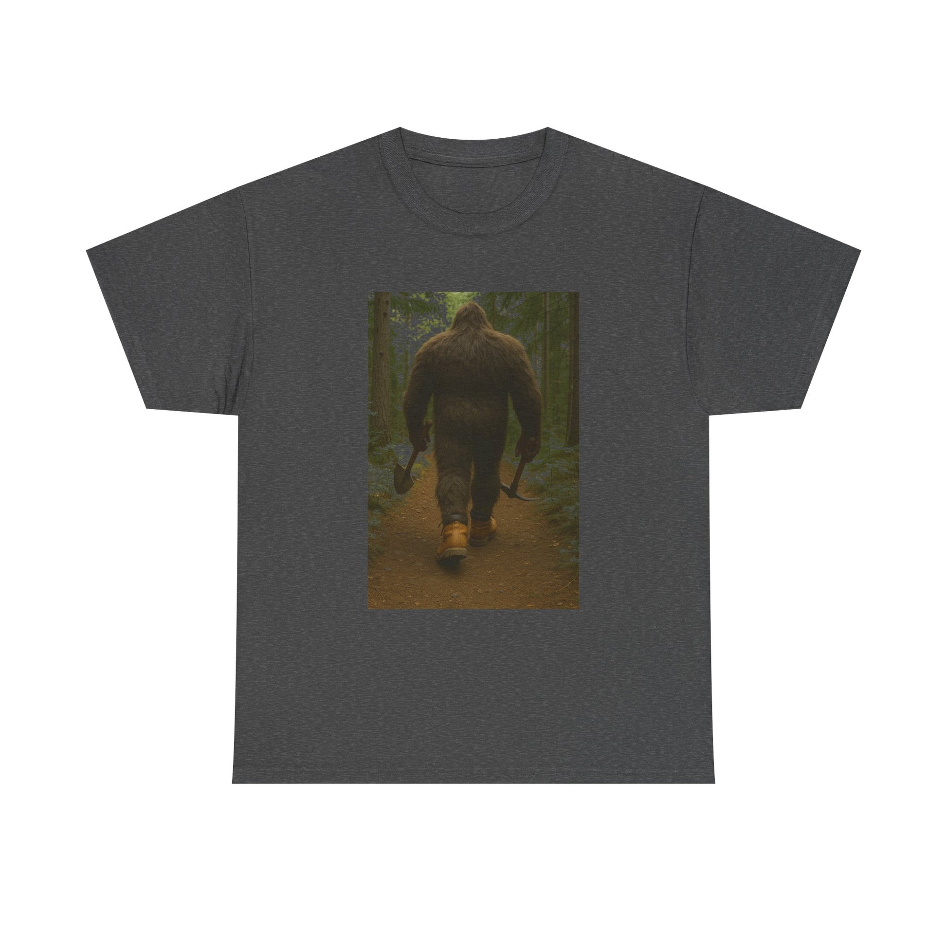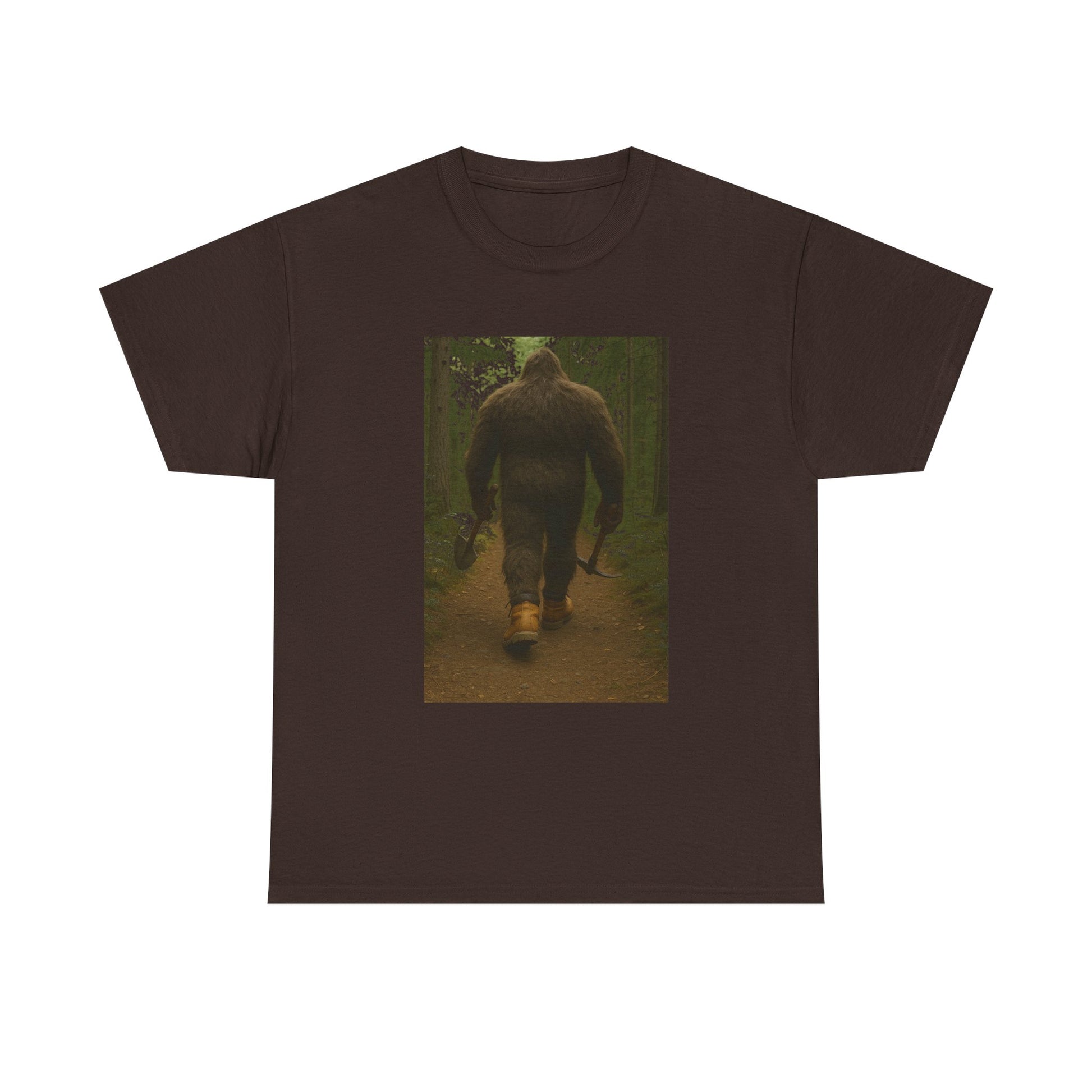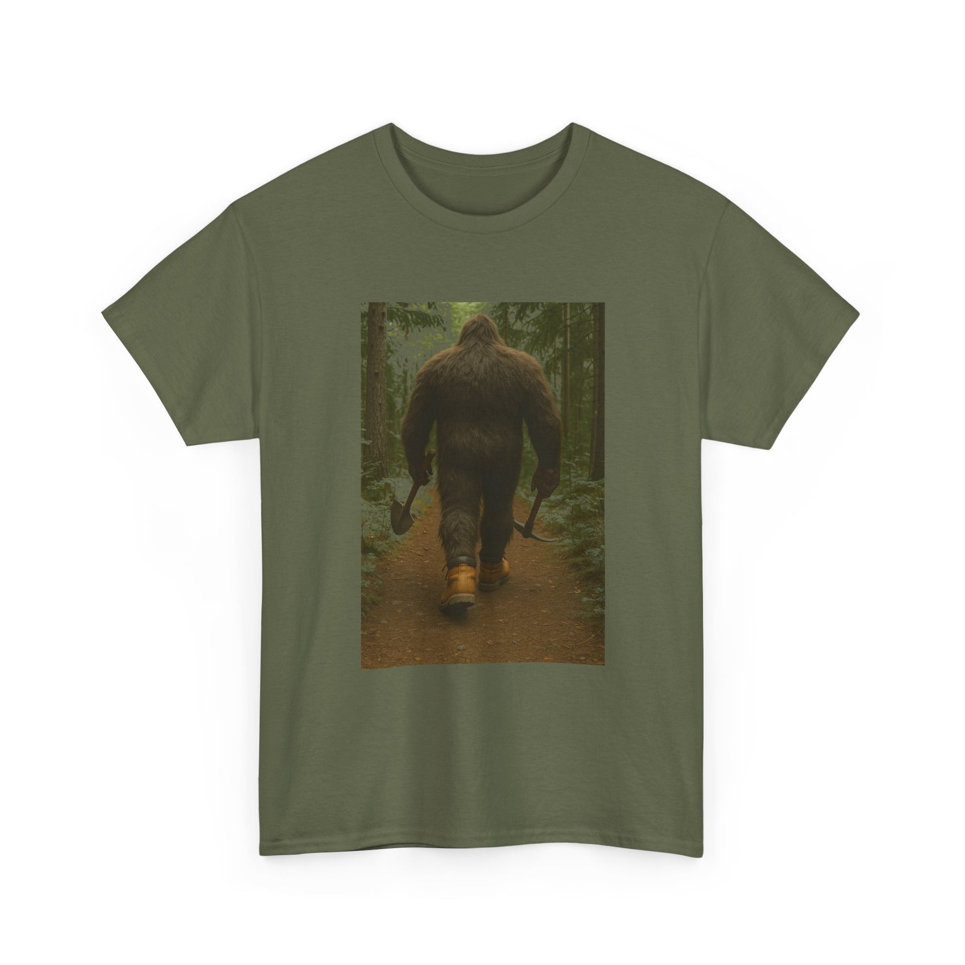 Sasquatch Work Boots Tee – Bigfoot Walking with Shovel & Pickaxe Funny T-Shirt