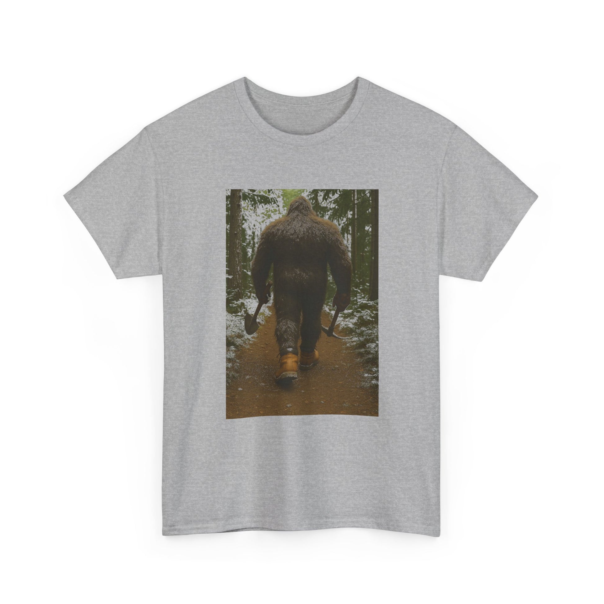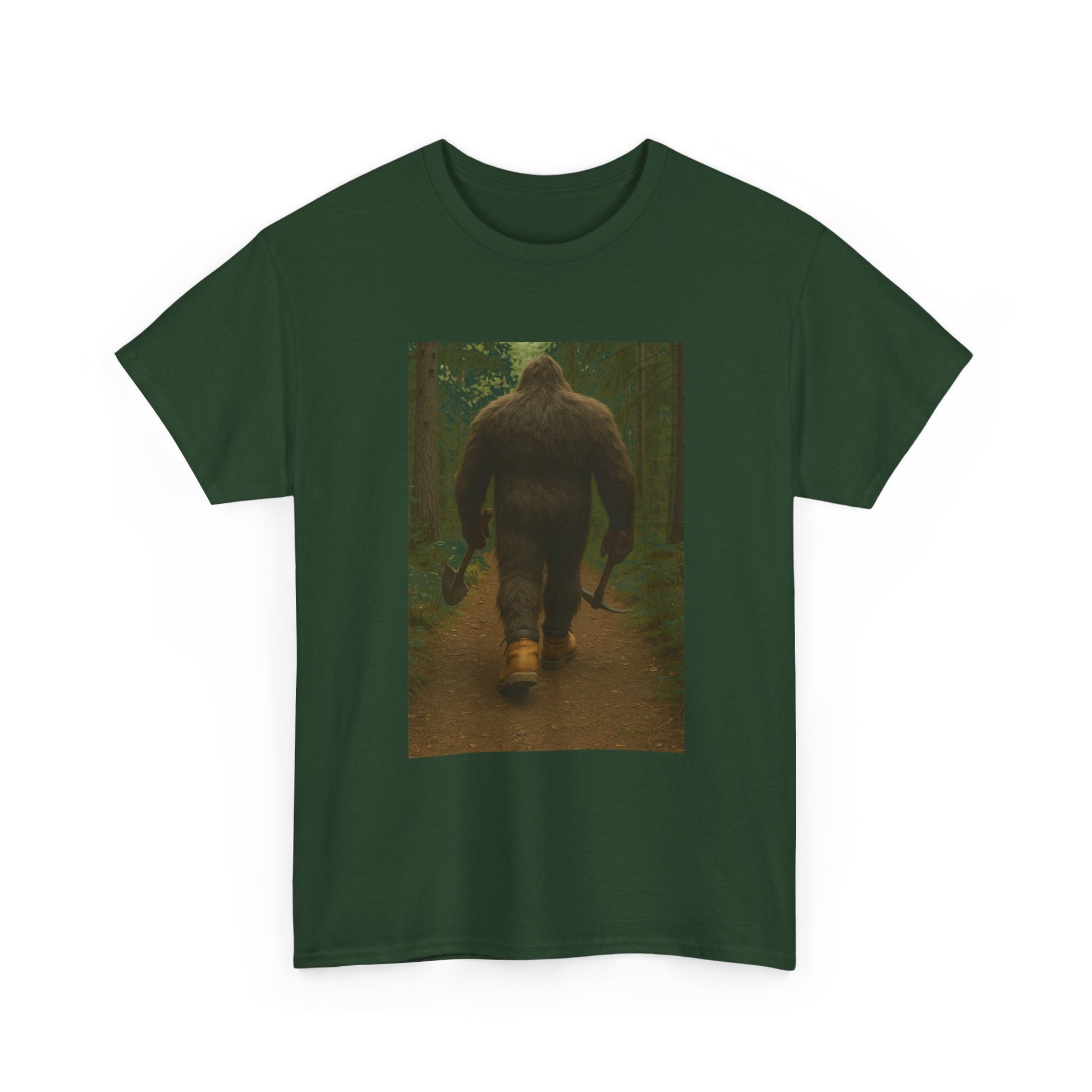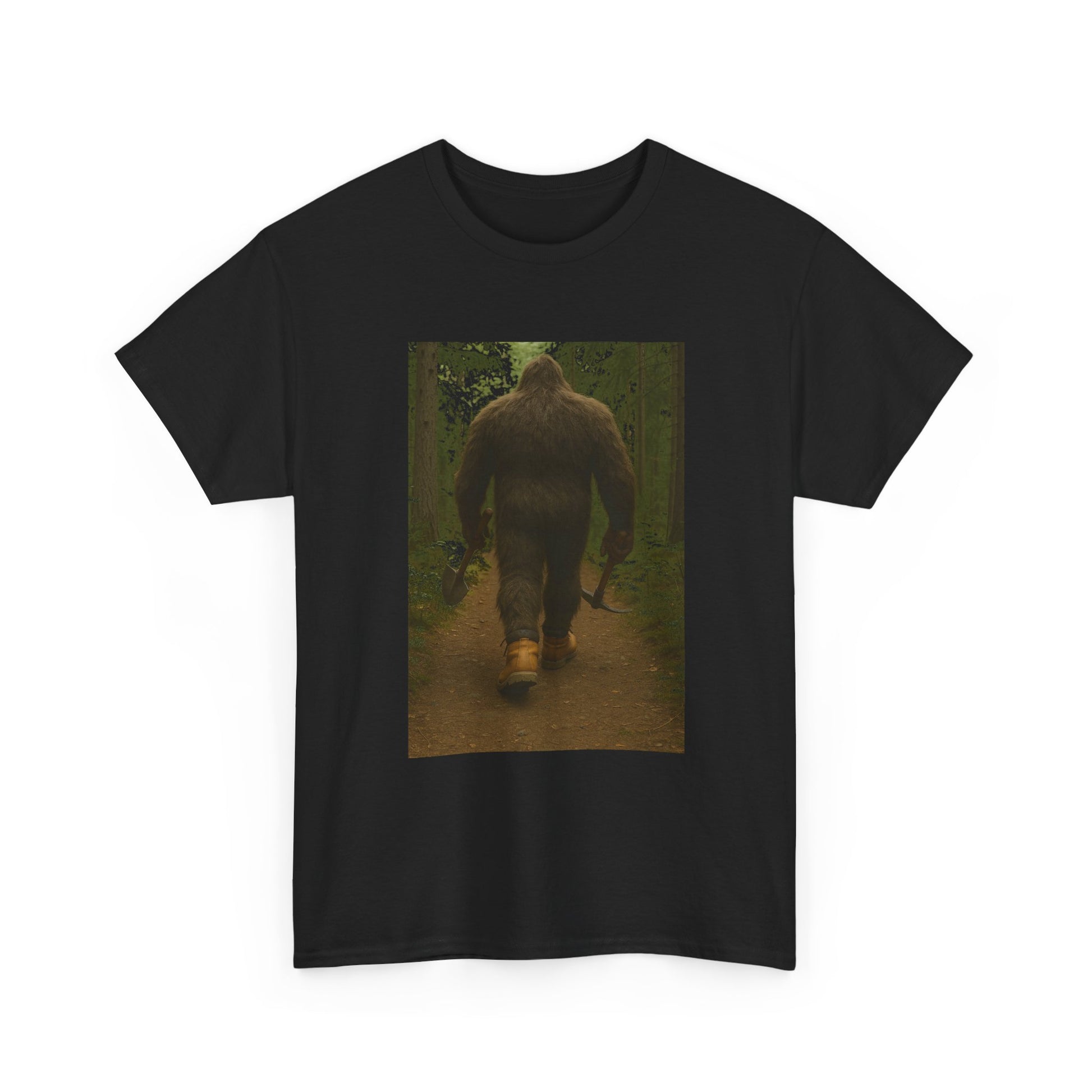 Sasquatch Work Boots Tee – Bigfoot Walking with Shovel & Pickaxe Funny T-Shirt