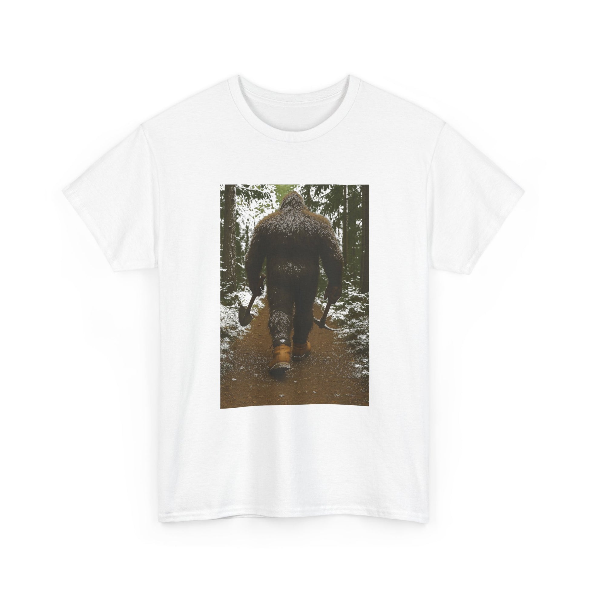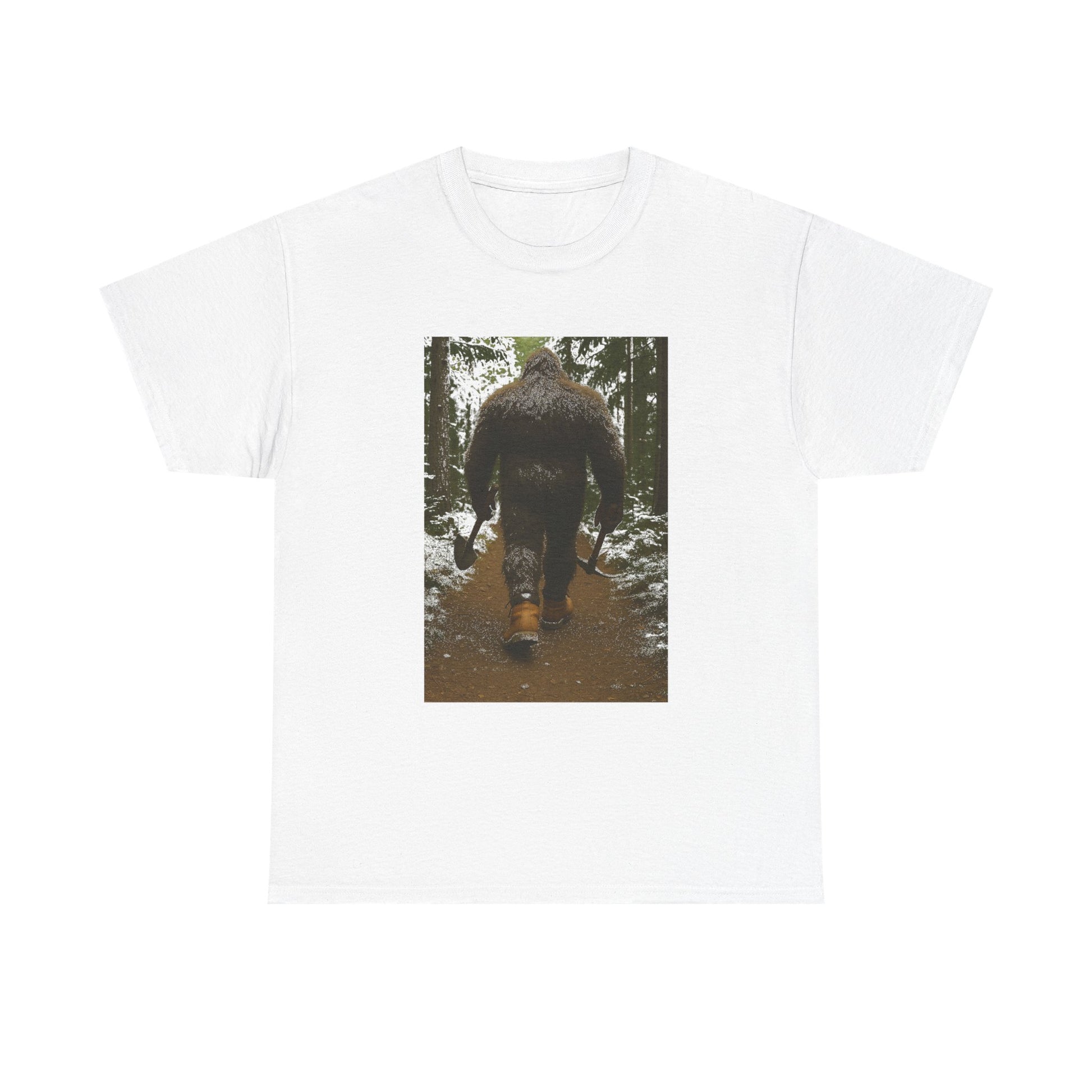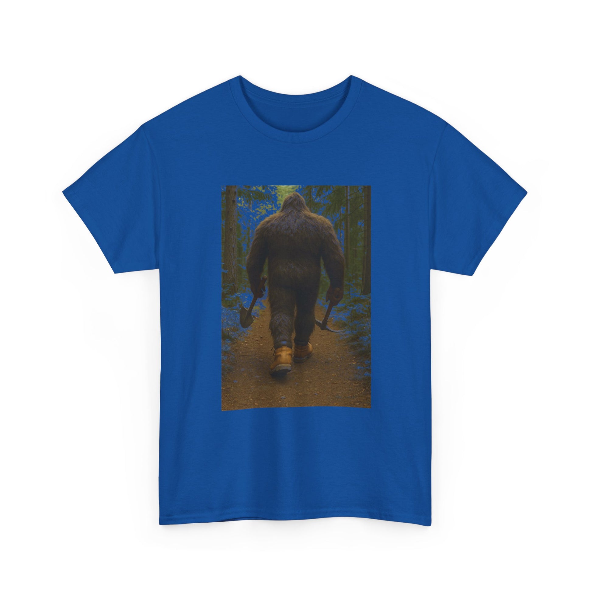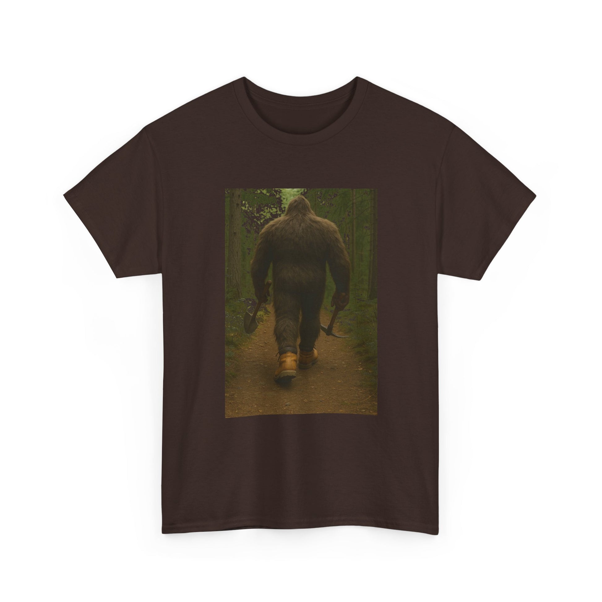 Sasquatch Work Boots Tee – Bigfoot Walking with Shovel & Pickaxe Funny T-Shirt
